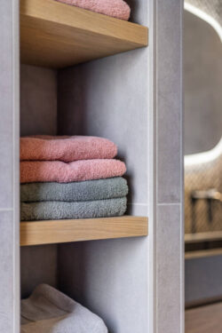 Nissen in de douche of bij het bad zijn een andere slimme oplossing. Ze vervangen losse rekjes en houden shampoo en zeep netjes bij elkaar, zonder het strakke beeld te verstoren. Door dezelfde materialen te gebruiken als op de wand, vallen ze nauwelijks op.