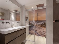 Een glazen wand is strak, licht en makkelijk schoon te houden. Vaak wordt deze optie toegepast achter het bad of de wastafel als spatscherm. In kleur of met print is het ook een decoratieve toevoeging.